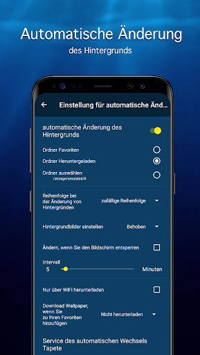 In der Anwendung wird eine automatische Hintergrundänderung Funktion (Live-Wallpaper) implementiert. Sie können die Quelle und das Intervall der Änderung selbst auswählen. Fügen Sie einfach die 4K Hintergründe zu Favoriten hinzu, ankreuzen Sie die entsprechende Position der Einstellungen und erfreuen Sie sich. Ihre allen gefallenden Unterwasserbilder werden sich auf dem Desktop und Sperrbildschirm im Wechsel ändern!