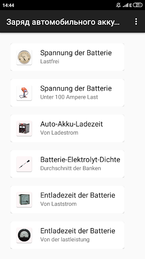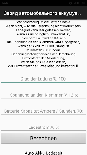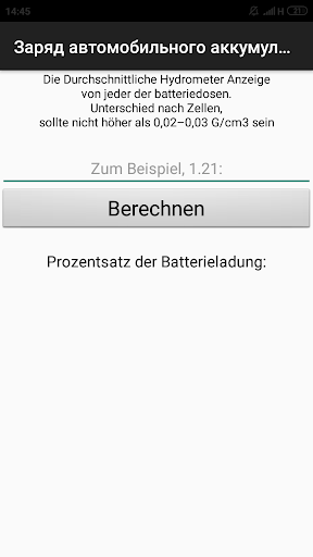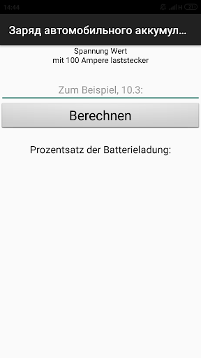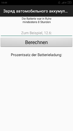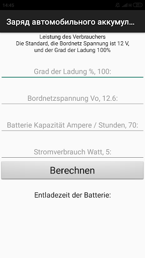 Die Anwendung ermöglicht es Ihnen, (innerhalb eines bestimmten Fehlers) den ladegrad der Batterie des Autos in Prozent zu bestimmen und auf die Notwendigkeit zu laden. Es genügt, einen der bekannten Parameter der Batterie einzugeben und das Ergebnis zu erhalten. Es ist auch möglich, die Laufzeit der Batterie des Autos zu erfahren, wenn Sie es an einen Verbraucher anschließen.