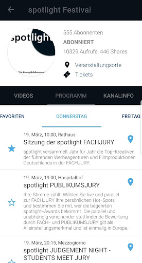 Schau den Zeitplan und Trailer, Case Studies oder andere Videos im Kanal eines Festivals und wähle deine Favoriten. So kannst du deine Teilnahme an dem Film- oder Musikfestival bzw. der Fachtagung individuell planen.