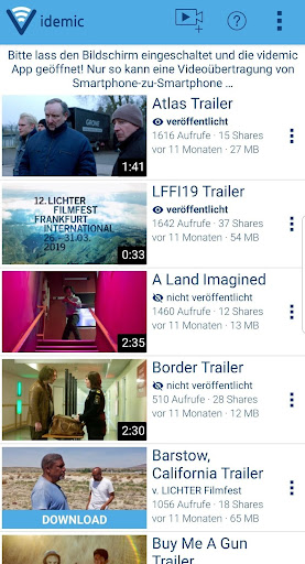 Besuche eine Veranstaltung eines videmic-Partners und werde jederzeit benachrichtigt, wenn du Making-of‘s von Filmen oder TV-Serien, Case Studies oder coole Promo-Videos auf dein Smartphone runterladen kannst, die nur für die Besucher des Festivals bzw. der Fachtagung zum Download bereitgestellt werden und nicht über das Internet veröffentlicht werden.