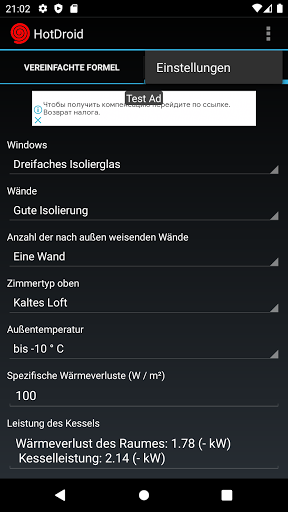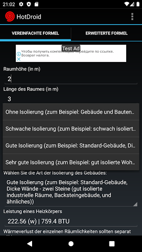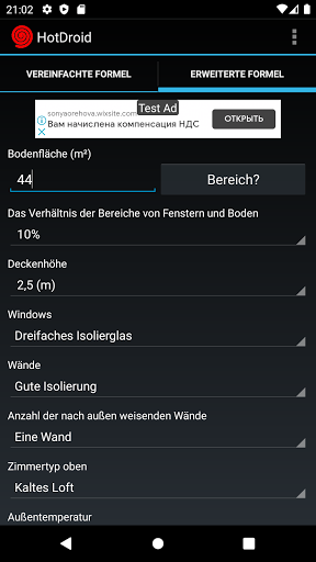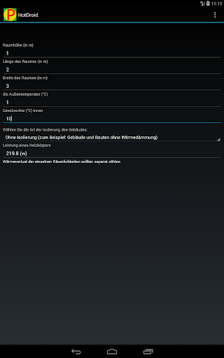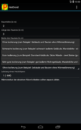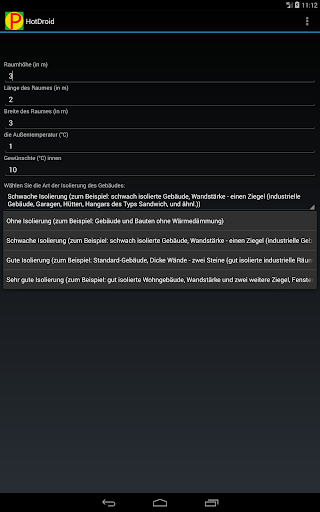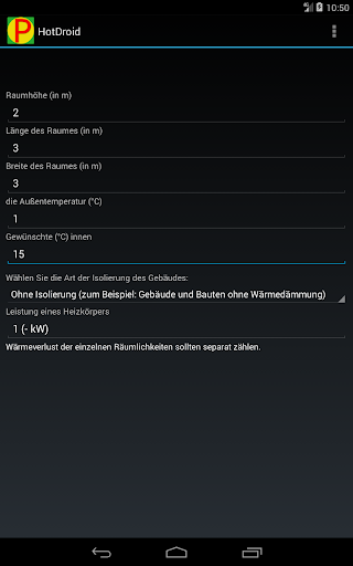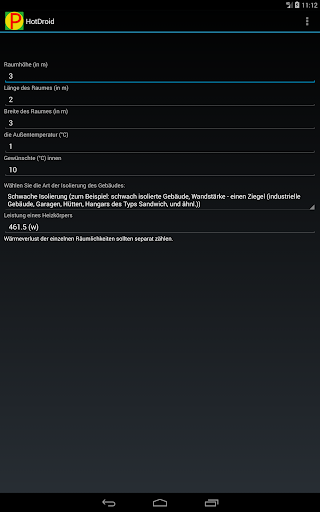 Die App berechnet die Leistung der elektrischen Heizvorrichtung, die für die Beheizung des Raumes, unter Berücksichtigung der gewünschten Temperaturdifferenz nach der Formel: V x T x k = kcal/h, wo: