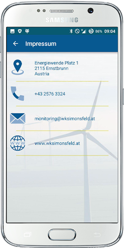 Neben den Daten zu den Windparks werden die Kontaktdaten (Telefonnummer, E-Mail, Webseite, Standort) von der Windkraft Simonsfeld AG in einem Impressum zur Verfügung gestellt.