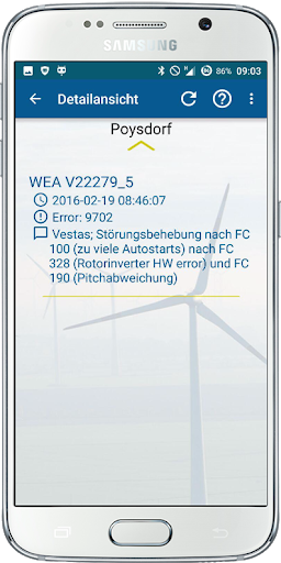 • Fehlermeldungen mit Beschreibungen: Fehlermeldungen werden in einer Liste dargestellt. Sie beinhalten den Turbinennamen, einen Zeitstempel, einen Error-Code und einen Kommentar.