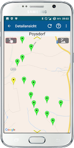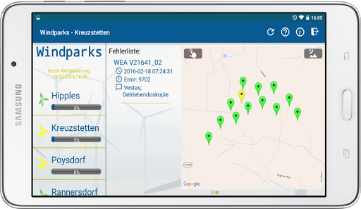 • Geografische Turbinendaten: Die Positionsdaten der Turbinen eines Windparks werden in einer Karte mit Markern angezeigt. Die Farbe der Marker repräsentiert den Status der Turbine.