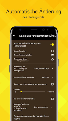 In der Anwendung wird eine automatische Hintergrundänderung Funktion (Live-Wallpaper) implementiert. Sie können die Quelle und das Intervall der Änderung selbst auswählen. Fügen Sie einfach die 4K Hintergründe zu Favoriten hinzu, ankreuzen Sie die entsprechende Position der Einstellungen und erfreuen Sie sich. Ihre allen gefallenden gelbe Bilder werden sich auf dem Desktop und Sperrbildschirm im Wechsel ändern!