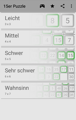 15er Puzzle Spiel hat verschiedene Erfolge, welche freigeschaltet werden können und Bestenlisten, wo sich Spieler untereinander messen können. Diese basieren auf der Zeit und den Anzahl Zügen, welche für den Abschluss eines Spiels benötigt werden.