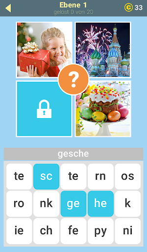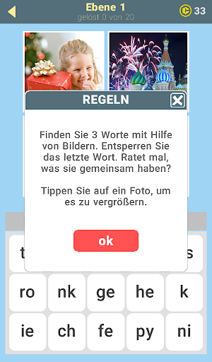 Finden Sie 3 Worte mit Hilfe von Bildern. Entsperren Sie das letzte Wort. Ratet mal, was sie gemeinsam haben? Tippen Sie auf ein Foto, um es zu vergrößern.