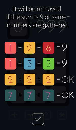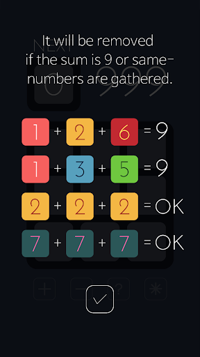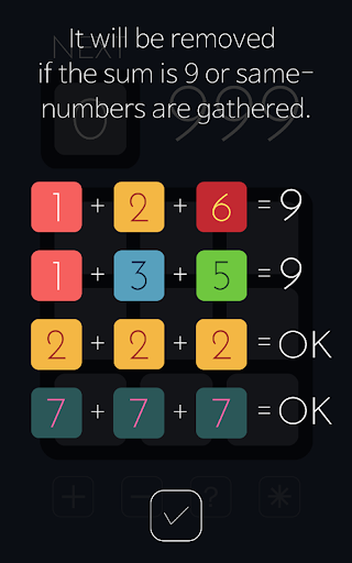 Versuchen Sie, die Blöcke ständig zu entfernen, indem Sie die Zahlen ordnungsgemäß in dem 9-Gitter ordnungsgemäß anordnen.Sie müssen weiterhin Blöcke entfernen, bevor das Feld voller Zahlen ist.