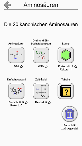 Diese App ist die einfachste und effizienteste Weg, um die Strukturen, Codes und Eigenschaften der 20 kanonischen Aminosäuren (Arginin, Glutaminsäure) und mehr als 20 verwandte Verbindungen (Cystin, γ-Aminobuttersäure) zu lernen.