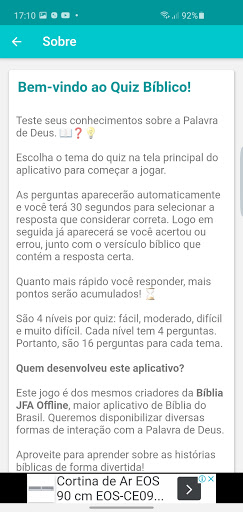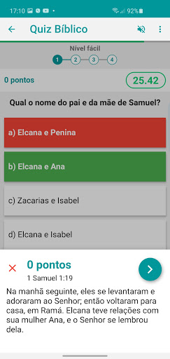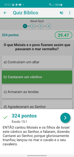 Sie haben nur 30 Sekunden, um die richtige Antwort auszuwählen. Und bald, nachdem er erscheint, wenn Sie mit dem biblischen Vers, zusammen mit dem biblischen Vers, der die richtige Antwort enthält, erscheint.
