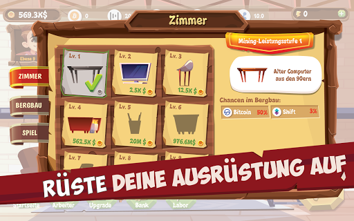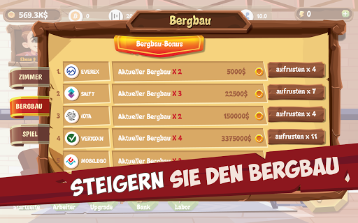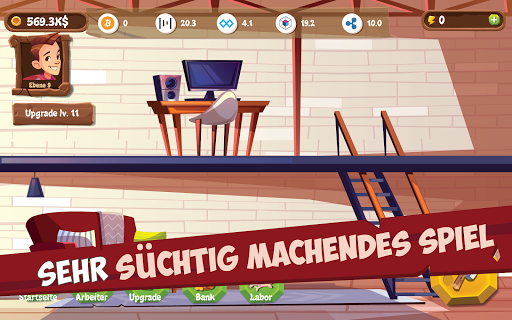Im Grunde, herunterladen. Es ist ein einfaches, interessantes und lustiges Spiel über Kryptowährung Bergbau und Gebäude ein eigenes Zimmer. Ja, die Ernte ist hier nicht Gemüse und Tiere, sondern Kryptowährung und Geld. Trotzdem ist es leicht und einfach, den Idleclicker Tycoon - Crypto currency Miner zu spielen! Fühlen Sie sich wie ein erfolgreicher Geschäftsmann, verdienen Sie Millionen, machen Sie Karriere vom Manager zum Top-Manager, vom Top-Manager zum Millionär und vom Millionär zum Milliardär. Und lassen Sie sich von anderen Milliardären beneiden. Denn Ihr Bergbauunternehmen ist auf dem Gipfel des Ruhmes und des Erfolges. Das Spiel hat eine Prestige-Funktion, ein beliebtes Feature in anderen Clickern. Ein Spieler kann auf Prestige klicken, um den gesamten Fortschritt zurückzusetzen und einen riesigen Bonus zu erhalten, der die weitere Entwicklung und die Machtstufen beschleunigt.