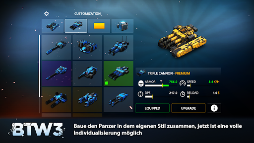 Auf dich wartet eine Welt voll großer Panzerschlachten. Verbessere Fertigkeiten, stimme den Panzer für sich ein: tausche die Tarnung, wähle die Waffen von den Raketenanlagen bis zu den Lasern und Railguns.