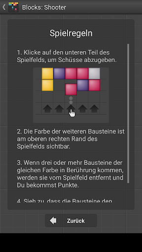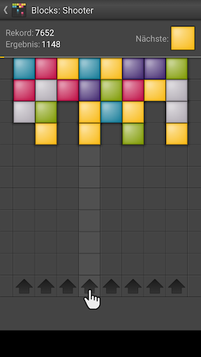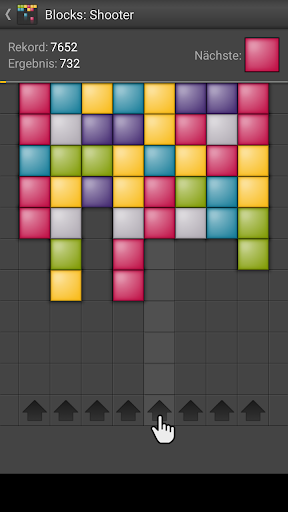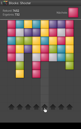 Zu Beginn des Spiels erscheint am oberen Rand des Spielfelds eine Reihe bunter Bausteine. Klicke auf den unteren Teil des Spielfelds, um Schüsse abzugeben.