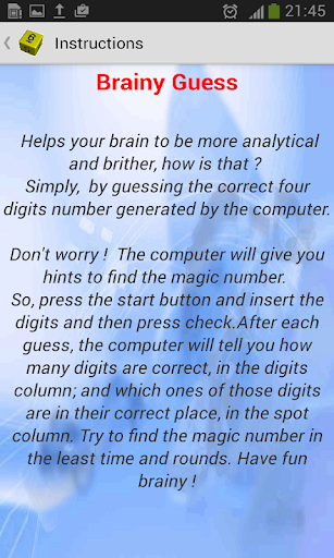 Einfach, indem Sie die korrekte vierstellige Nummer erraten, die vom Computer generiert wird.MEINE Sorge!Der Computer gibt Ihnen Hinweise, um die magische Zahl zu finden.Drücken Sie also die START-Taste und setzen Sie die Ziffern ein und drücken Sie dann das Prüfen. Dann drücken Sie an, dass der Computer Ihnen sagt, wie viele Ziffern in der Spalte Ziffern korrekt sind.Und welche dieser Ziffern befinden sich an ihrer richtigen Stelle in der Spalte Säule.Versuchen Sie, die Zaubernummer in den wenigsten Zeiten und Runden zu finden.Viel Spaß beim Brainy!und Gehirn es weiter.