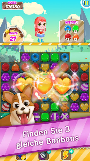 Ein einfaches Puzzlespiel, in welchem man 3 identische Süßigkeiten der gleichen Farbe einander zuordnen muss.