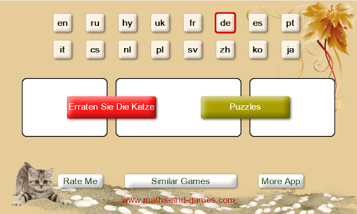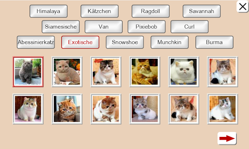 Im Spiel "Puzzles" sind 13 Themen: «Himalaya», «Kätzchen», «Ragdoll», «Savannah», «Siamesische», «Van», «Pixiebob», «Curl», «Abessinierkatze», «Exotische», «Snowshoe», «Munchkin», «Burma».