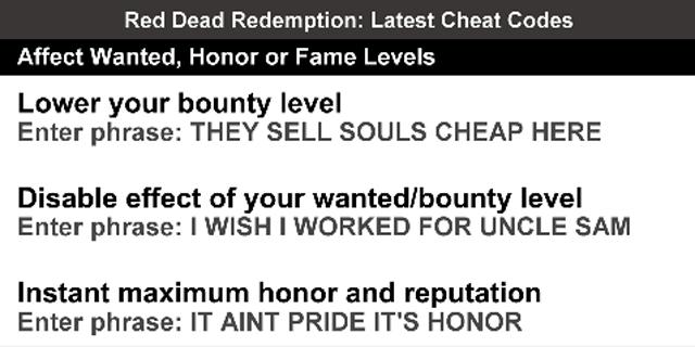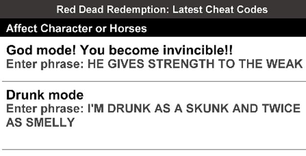 Die Beschreibung von Cheat Codes for Red Dead Redemption