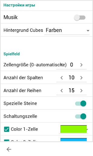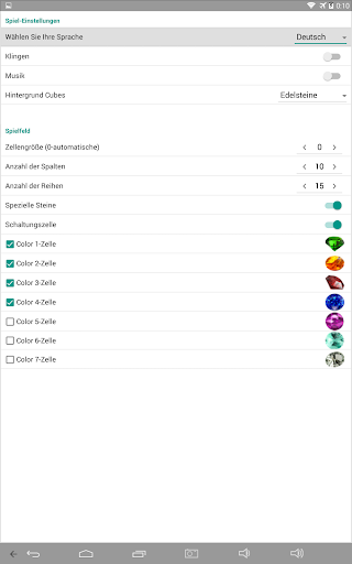 In den Spieleinstellungen gewählten Größe des Spielfeldes, Zell Farben, Sound-Effekte, sowie die Anwesenheit von speziellen Steinen und bomb.