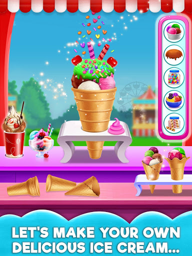Dekorieren Sie Ihre Eisplatte mit köstlichen Aromen von Eiscreme und Sahne, Früchte, Toppings, Wafer auf Eiscreme.