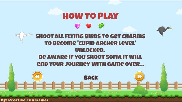 Cupid Archer remains a challenging Arcade game with myriad tasks and objectives at multiple levels. In this Bird Hunting Game, you assume the role of the Cupid Hunter. Your girlfriend, Sofia, will be waiting for you at a further level. Your objective is to make her happy by winning the game by virtue of your unrivaled archery skills. In this Bow and Arrow Game you are not really supposed to shoot the Sparrows but the colored birds in order to secure the Charms.
