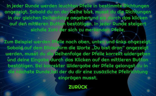 Folgen Sie den Richtungen. Strapazieren Sie Ihr Gedächtnis durch schwierigere Ebenen in jedem Level. Zunächst wird es relativ simpel und einfach erscheinen, doch mit jeder Stufe werden Sie realisieren, dass es doch kein Kinderspiel ist. Doch nach einigem Trainieren werden Sie dazu in der Lage sein, die Level zu meistern. Testen Sie, wie trainiert ihr Gedächtnis bereits ist und teilen Sie Ihre Ergebnisse mit Ihren Freunden.