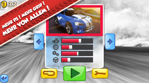 Zu Beginn steht dir nur ein einziger Wagen zur Verfügung. Mit jedem Rennen verdienst du virtuelle Münzen, mit denen Du deine Rennsemmel verbessern kannst. Neuer Motor, bessere Reifen, schnelleres Getriebe? Kein Problem, solange du die nötige virtuelle Kohle in den Rennen gewonnen hast.