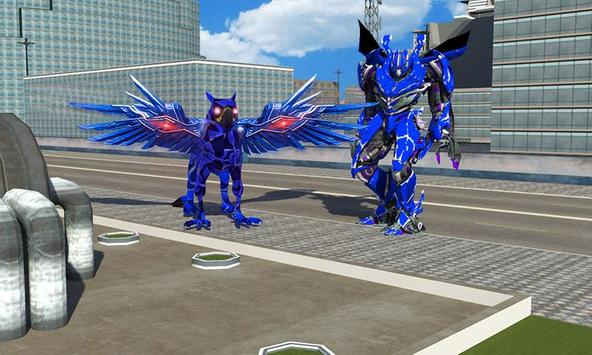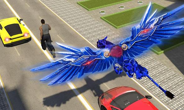 Activate eagle flight mode and watch the wings coming out. Transform flying robot into robot eagle that has modern shooting weapon that will destroy gangsters with super strike. Enjoy flying robot eagle hero transformation into flying monster eagle sim. Chase enemies causing destruction in futuristic city.