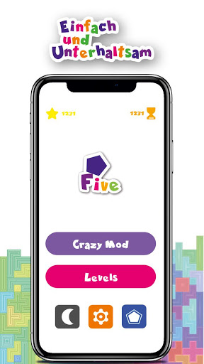 Dieses Spiel ist aufregend und es macht Spaß mit sich selbst und mit seinen Freunden zu konkurrieren. Sie können Five jederzeit und überall spielen. Das Spiel bietet zwei Spielmodi um Sie zu unterhalten. Sie können entweder den “Level”-Modus oder den “Verrückten” Modus mit endlosen Steinkombinationen wählen. Ein weiteres Feature ist unser Nachtmodus, der das Spielen am Abend für Ihre Augen angenehm macht.