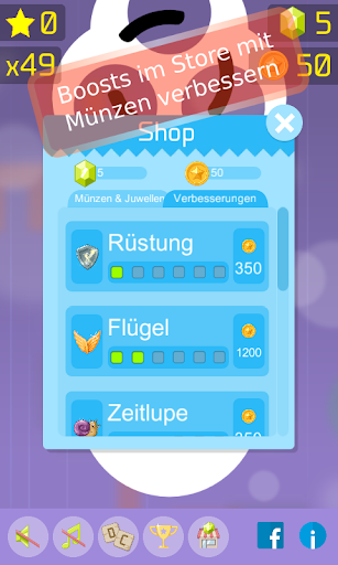 * Sammle Münzen und Juwelen umd die Fähihkeiten und Power Ups upzugraten und beim Abstürzen wiederaufzuerstehen