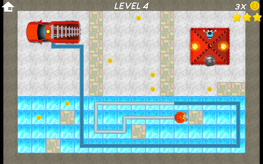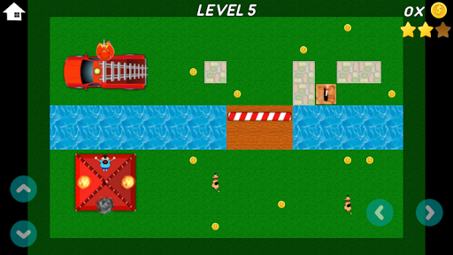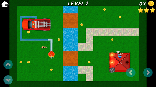 Fireman! Extinguish a fire. Find right path to the fire and beware of angry dog. On the journey through the maze you have to unlock the door, closing the route to your destination. Carefully cross the river and don't get lost in the fire hose. Test your skills on the slippery ice, which you have to cross on the way to the goal. Pick up 10 coins to unlock the next level.