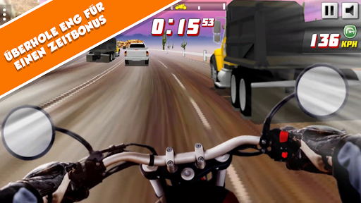 Hier geht es ums Gasgeben, um das möglichst knappe Überholen von Autos und im Idealfall das Einsammeln möglichst vieler Münzen auf dem Weg zum nächsten Checkpoint. Denn damit kannst du deine Mühle upgraden, indem du einen neuen Motor oder bessere Reifen montierst. Richtig interessant wird es aber natürlich erst, wenn du dir neue Bikes kaufst, die alles noch ein wenig besser können und vor allen Dingen schneller sind.