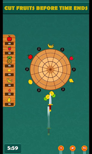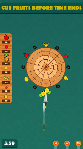 Wirf das Messer im die Stämme, um sie zu zerbrechen, die Früchte zu zerschneiden und Sterne zu bekommen. Schlagen Sie nicht die Messer und die Bombe. Schieße vorsichtig auf das Ziel und werde zum Leistung-Booster! Schließe dein Ziel im 10 Sekunden ab und schieße auf die hohen spitzen Früchte. Sie können Leistungsverstärker verwenden.