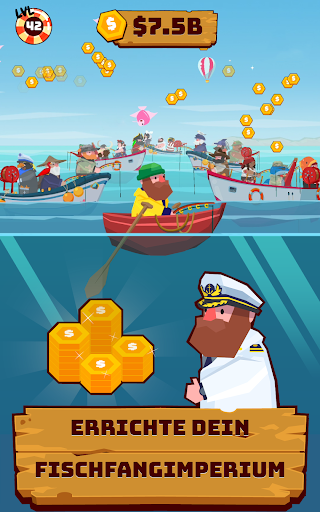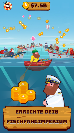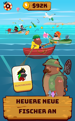 – Schalte neue Fischer frei, die in deiner Abwesenheit für dich Geld verdienen!