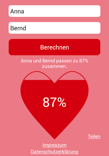 *Natürlich kann kein Algorithmus dieser Welt berechnen, wie gut zwei Personen wirklich zusammenpassen. Die App berechnet somit auch nicht den wirklichen Wert, sondern dient lediglich zur Unterhaltung.