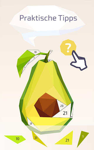 Genießen Sie eine Vielzahl von 3D-Bildern von Früchten, Tieren usw. Wählen Sie im Hauptmenü Ihre Lieblingsbilder aus und beginnen Sie mit der Pixelanpassung. Jedes Bild hat eine unglaubliche Farbpalette. Faszinierende Malvorlagen mit coolen Farben, die mit Zahlen gekennzeichnet sind, können einfach gefüllt werden, indem mehrfarbige Polygone an den entsprechenden Stellen platziert werden. Im Menü auf der rechten Seite "Meine Bilder" können Sie weiterhin alle fantastischen Meisterwerke sammeln, die Sie erstellen!