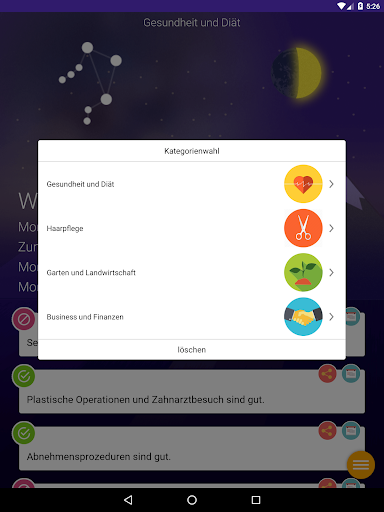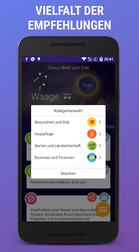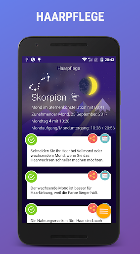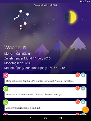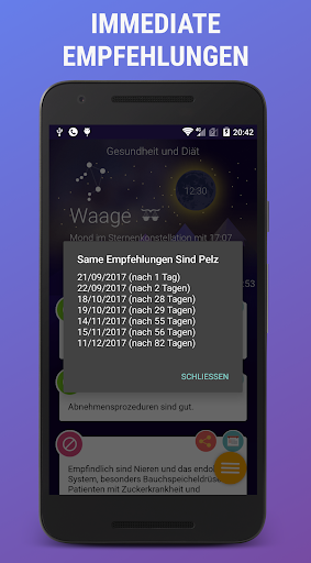 Sie können Ihre Pläne jeden Tag korrigieren, zum Beispiel, wann sollen Sie lieber operiert werden, um die schnellste Genesung zu haben, oder wann sollen Sie zum Friseur gehen, damit Ihres Haar schöner werden, wann sollen Sie Ihre Blumen giessen. Dazu enthält der Kalendar die erweiterten Empfehlungen über den allseitigen Einfluss der Mondrhzthmen auf unseres Leben und unsere Gesundheit.