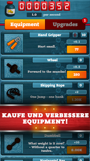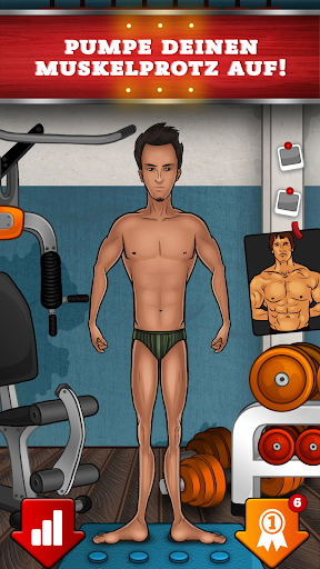 Kaufe Trainingsgeräte und Verbesserungen, um einen schmächtigen Nerd in einen echten Muskelprotz mit riesigen Bizepsen und einem Sixpack zu verwandeln.