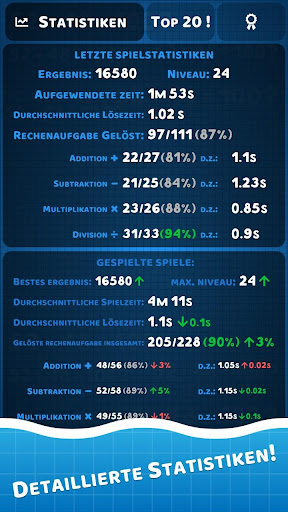 In diesem Mathe-Spiel müssen Sie alle Ihre Kenntnisse der Mathematik und Multiplikationstabelle zeigen arithmetische Beispiele auf addition, Subtraktion, Multiplikation und division zu lösen. Jedes mathematische Spiel in der Partitur trainiert arithmetische Fähigkeiten. Aber wenn die Zeit, ein Beispiel zu lösen, begrenzt ist, entwickelt sich diese Fähigkeit auf einer höheren Ebene. Je mehr mathematische Beispiele Sie lösen, desto schwieriger sind die Beispiele und desto schneller ist die Zeit zum nachdenken. Nach jedem Spiel sehen Sie detaillierte Statistiken Ihrer mathematischen Fähigkeiten.