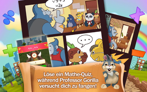 Professor Gorilla hat ein neues Quiz - werden unsere frechen tierischen Freunde im Quiz schneller als der Professor sein oder werden sie erwischt? Stelle deine Reflexe und mathematischen Fähigkeiten auf die Probe in diesem actiongeladenen Spiel! Wähle zwischen Trainings- und Quiz-Modi. Teste dein mathematisches Wissen mit Fragen aus dem Kindergarten bis zu Klasse 6 des mathematischen Curriculums des US Common Core Standards (CCSS), GB usw. Für eine größere Herausforderung, werden die Fragen regelmäßig aktualisiert. Schalte unterschiedliche Charaktere frei und übe mit ihnen Addition, Subtraktion, Multiplikation und Division. Weitere Informationen für Eltern und Pädagogen finden Sie unter: http://www.babycortex.com/math-run/
