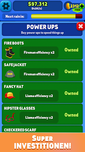 Erwerben Sie neue Ausrüstung, um Ihren Umsatz und Power-Ups zu erhöhen, um die Dinge zu beschleunigen! Schläuche, Sprinkler, Löschfahrzeuge, Glückshosen und Charme, fremde Generatoren und vieles mehr. Alles, was zählt!