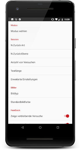In den Einstellungen können Sie den Prozentsatz der Köderversuche steuern, die die Aufgabe erschweren. Lure-Versuche präsentieren Stimuli, die n-back plus oder minus einem Versuch auftraten. Das heißt, sie werden einen Versuch vom Zielversuch versetzt (n-back).