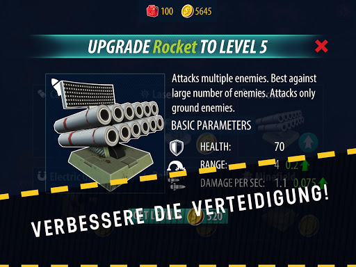 * Starke Türme um deine Verteidigung zu verbessern: Kanonen, Laser, Raketenwerfer, Elektrogeschütze, Schienenkanonen, Minenfelder