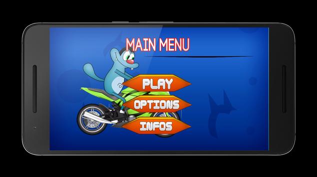 Oggy Moto Bike Speed and fast drive it'is designed for you and your kids and childrens to have fun and spend great moment with them, what we have without our kids boys and girls so just share with them your free time, this game it's one of the greatest racing game of oggy world the blue cat thing problems with cockroaches enemies and monsters.