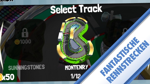 Wenn du bei der Kurvenhatz genügend Coins sammelst, kannst du schnellere Rennwagen freischalten und neue Rennstrecken bereisen.