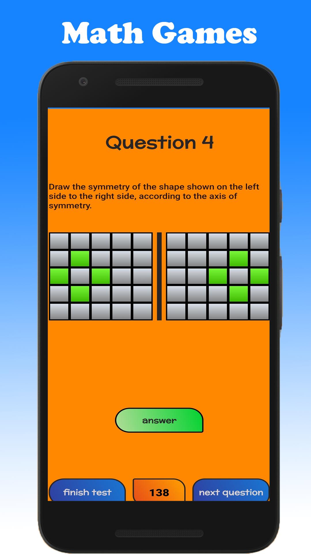 - Number Games: There are several other sections rather than 4 operation questions. Number Serials, Greater or Lesser Questions, Symmetry Test in Coordinate Axis, Odd or Even Numbers.