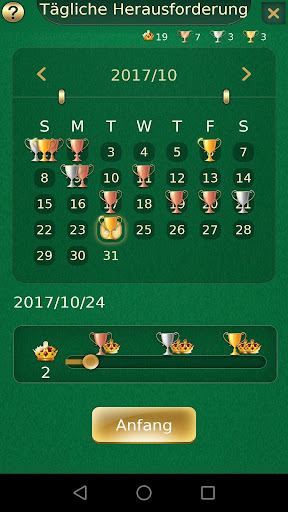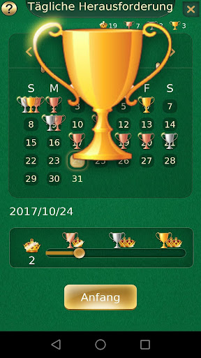 Tägliche Herausforderungen - Drei Herausforderungen warten jeden Tag auf das Spielen. Solitär belohnt Gewinner mit Gold / Silber / Bronze Cups und extra Krone (n). Variante tägliche Aufgabe von leicht bis schwer: Eine Kartenzeichnung, Eine Kartenzeichnung ohne Hinweise, drei Kartenzeichnung.