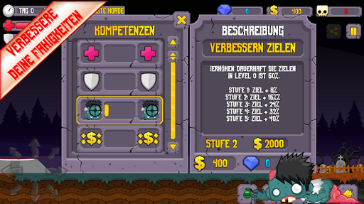 Im Laufe der Tage werden die Horden der Wanderer gefährlicher sein. Sie müssen Ihr Ziel, Geschwindigkeit, Sprung, etc. völlig kostenlos verbessern um die rücksichtslosen Zombies zu überleben. Die Zeit läuft gegen dich, und je mehr du vorbereitet bist, desto länger kannst du die Horden der Untoten überleben.