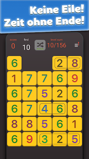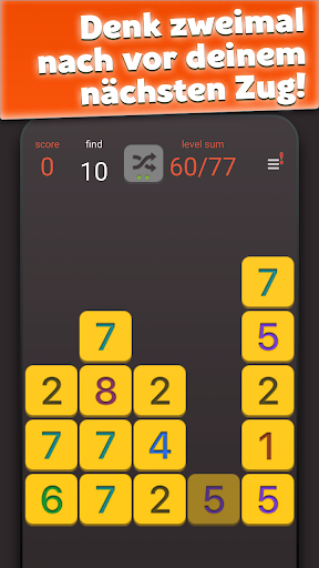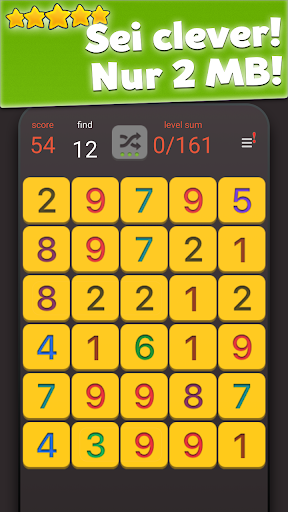 - Wenn du keine Züge mehr hast und die Summe aller gesammelten Summen höher ist als die Summe der verbliebenen Zahlen auf dem Feld, hast du das Level abgeschlossen und kannst das nächste Level beginnen.