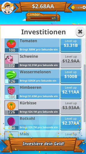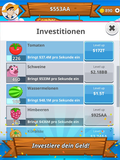 Verdiene mehr, indem du in Kühe, Schweine, Wassermelonen und vieles mehr investierst. Du kannst sogar einen Geldbaum pflanzen. Klar, weiß doch jeder: Geld wächst auf BÄUMEN!
