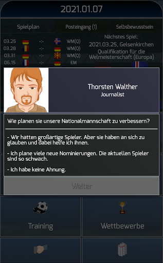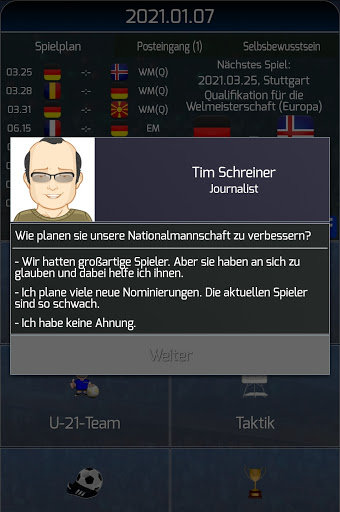- Interviews mit Journalisten, ruft mit Ihren Spielern - jeder Ihre Antwort Auswirkungen auf ihre Moral und andere Parameter. Sei vorsichtig, was zu sagen!